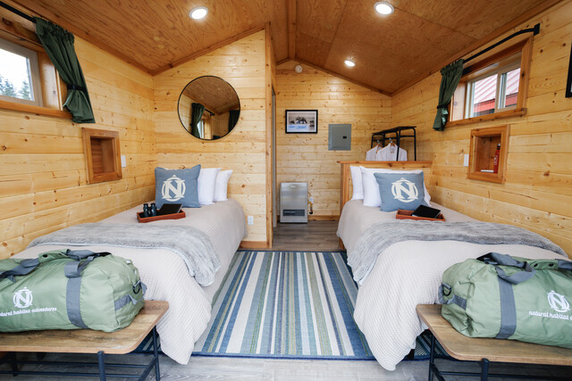 Ten brand-new handcrafted cabins overlook Chinitna Bay, surrounded by some of the most pristine wilderness on Earth. Finished in birch and knotty pine, each cabin has a front wall of windows that frame uninterrupted views of the beach and bay—including bears that forage for clams on the tide flats right in front of you! Appointments include two comfortable twin beds, electrical outlets, en suite bathroom with flush toilet, a sink with hot running water, and a propane heater to keep the coastal chill at bay. Hot showers are available in the nearby bathhouse.